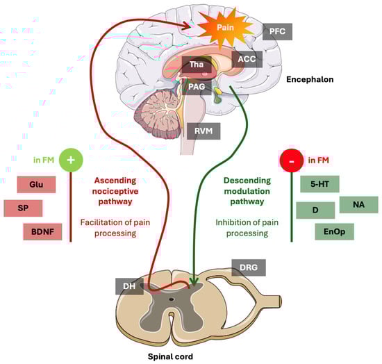 Furthermore, functional magnetic resonance imaging (fMRI) studies reveal reduced activity and altered connectivity in DPMS structures, such as diminished PAG and ACC engagement during pain modulation tasks [68,69] and positron emission tomography (PET) imaging shows altered opioid receptor availability in DPMS regions in fibromyalgia [70]. Neurochemical studies reveal decreased serotonergic and noradrenergic tone, impairing descending inhibitory signaling [70,71]. This dysfunction disrupts the balance between pain facilitation and inhibition, promoting persistent pain and symptom exacerbation. Reduced levels of 5-HT and 5-HT-receptor dysfunction decrease descending inhibition and contribute to affective symptoms [72]. Deficits in signaling associated with NA impair pain inhibition and arousal regulation [73]. Altered dopaminergic neurotransmission, involving D, affects reward processing, fatigue, and pain perception [74]. Increased activity of Glu pathways enhances excitatory signaling and CS [33]. Elevated cerebrospinal fluid (CSF) concentrations of SP correlate with pain intensity [75]. The imbalance of these neurotransmitters represents the basis for pharmacologic interventions targeting serotonin-noradrenaline reuptake inhibitors (SNRIs), D agonists, and Glu modulators [76].