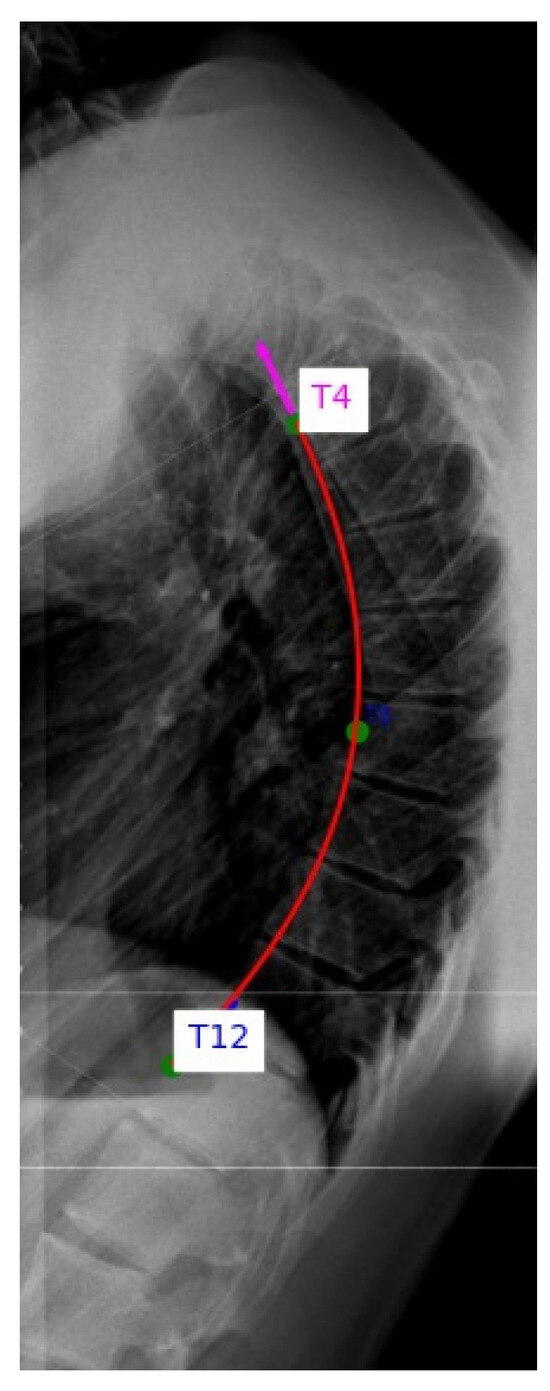 During each session, the rater manually selected three anatomical landmarks on the X-ray: the anterior vertebral wall midpoints of T12, T8 and T4. These vertebral levels were chosen because they represent the distal, middle and proximal regions of the thoracic curvature and are easily identifiable on lateral radiographs, thereby reducing interobserver variability [12,13]. These points define the curvature of the thoracic spine and were chosen to approximate the kyphotic apex and boundary levels. Given that visualization of the upper thoracic vertebrae (especially T4) can be partially obscured by shoulder or scapular overlap, a standardized vertebral identification protocol was applied. Vertebral levels were numbered by counting ribs inferiorly from T1 and confirmed using the characteristic morphology of T12 and L1 as reference points. When T4 could not be confidently localized, T5 was used instead and this substitution was documented. Images with substantial rotation, beam angulation or obscured vertebral endplates were excluded from analysis.