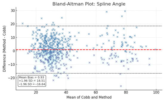 Bland–Altman plot comparing spline method with Cobb angles. The red dashed line represents the mean difference (bias), while the black dashed lines indicate the upper and lower limits of agreement (mean ± 1.96 SD).