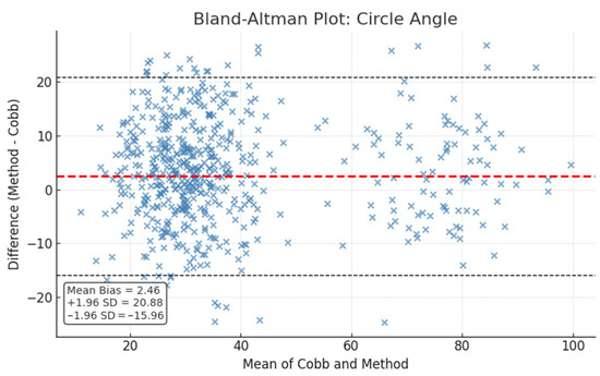 Bland–Altman plot comparing circle method with Cobb angles. The red dashed line represents the mean difference (bias), while the black dashed lines indicate the upper and lower limits of agreement (mean ± 1.96 SD).