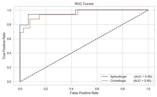 Bland–Altman analysis revealed a mean bias of −0.93° for the spline method and 2.46° for the circle method, with limits of agreement spanning approximately −16.6° to 18.5° for spline and −16.0° to 20.9° for circle. These additional metrics, including ROC AUC, Levene’s test, Bland–Altman mean bias and limits of agreement are detailed in Table 4.