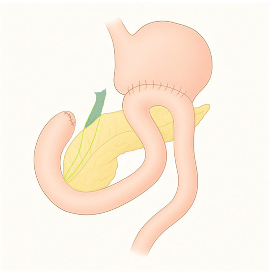 Pancreaticoduodenectomy is the gold standard for treating tumors of the head of the pancreas, ampullary lesions, distal bile duct tumors, and selected duodenal lesions. This complex surgery entails en bloc resection of the pancreatic head, duodenum, gallbladder, distal bile duct, and frequently part of the stomach, followed by reconstruction of gastrointestinal continuity with pancreaticojejunostomy, hepaticojejunostomy, and gastrojejunostomy (Figure 4) [10].