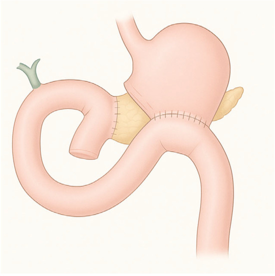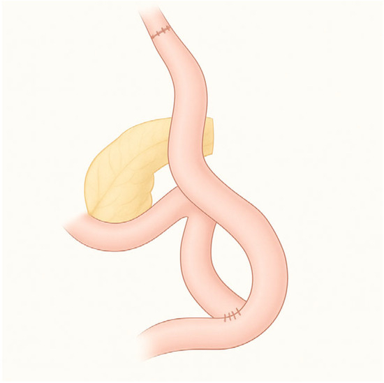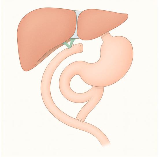 - Barakat, O.; Creden, S.P.; Holmes, D.M.; Ageedi, W. Rethinking Biliary Reconstruction: Alternatives to Standard Roux-En-Y Hepaticojejunostomy. J. Surg. Case Rep. 2025, 2025, rjaf542. [Google Scholar] [CrossRef] [PubMed]