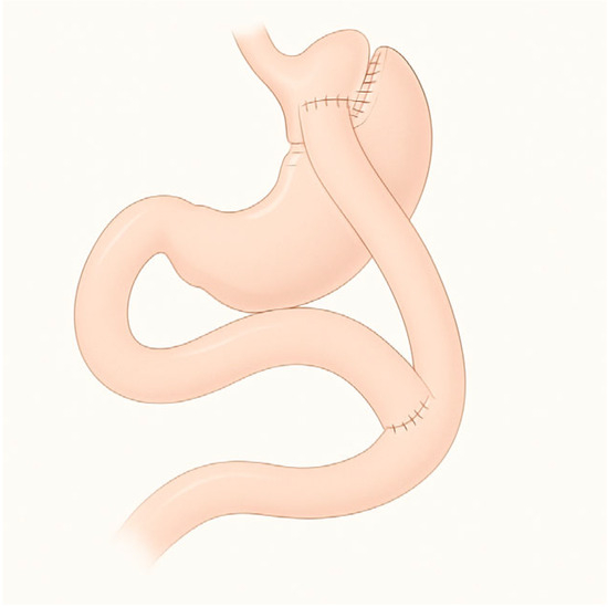RYGB is the most widely performed bariatric procedure worldwide. It consists of creating a small gastric pouch anastomosed to the jejunum, bypassing the excluded stomach and duodenum (Figure 3). This operation was originally designed for weight loss but is now equally valued for its metabolic benefits in patients with type 2 diabetes and severe obesity. Variations in limb length are frequent: long biliopancreatic or alimentary limbs are often employed in super-obese patients or those with severe metabolic disease to increase malabsorptive effects. An alternative is the mini-gastric bypass, in which a long gastric pouch is anastomosed directly to a jejunal loop. Despite its effectiveness in reducing calorie intake and weight loss, it carries the risk of bile reflux, which remains a subject of ongoing debate and study [8].