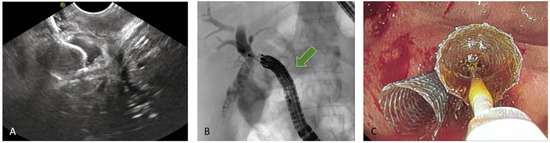 - Iwashita, T.; Yasuda, I.; Mukai, T.; Iwata, K.; Doi, S.; Uemura, S.; Mabuchi, M.; Okuno, M.; Shimizu, M. Endoscopic Ultrasound-Guided Antegrade Biliary Stenting for Unresectable Malignant Biliary Obstruction in Patients with Surgically Altered Anatomy: Single-Center Prospective Pilot Study. Dig. Endosc. 2017, 29, 362–368. [Google Scholar] [CrossRef]