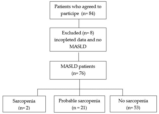 The sample consisted of 76 patients with MASLD. Only two patients were diagnosed with sarcopenia, and 21 (27.6%) with probable sarcopenia (Figure 1).