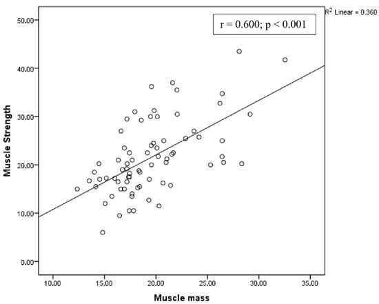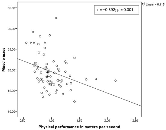 A positive correlation was observed between muscle strength and muscle mass, and a negative correlation was observed between physical performance and muscle mass (Figure 2 and Figure 3, respectively).