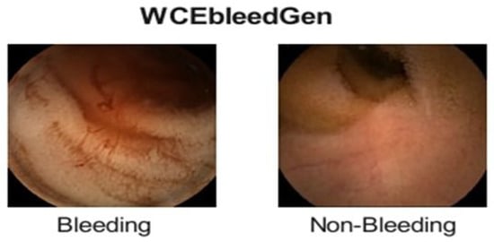 WCEbleedGen (Dataset B) is a WCE dataset containing annotated bleeding and non-bleeding frames of GIT, collected from different open-source datasets (available at: https://zenodo.org/records/7548320, (accessed on 3 February 2025)). It is a highly balanced dataset composed of 1309 bleeding frames and 1309 non-bleeding frames. This dataset aims to train ML models for automated bleeding detection, classification, segmentation, and localization. Sample images of this dataset are shown in Figure 2.