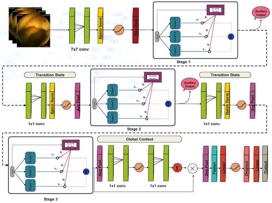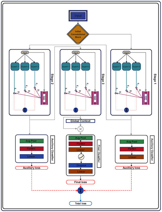Gastrointestinal diseases contain a lot of inter-class resemblances and intra-class differences, which make it difficult for traditional models to distinguish among various classes. Moreover, these images contain both fine-grained local and global features, requiring a multi-scale feature extraction. To overcome these challenges, we proposed a hierarchical multi-stage attention-based model named “GID-Xpert”, which incorporates a mixture of experts with dynamic routing for accurate and efficient classification of different gastrointestinal diseases. The proposed approach consists of three modules: a feature extraction backbone, multi-stage expert blocks, and a dynamic routing mechanism. Additionally, the model incorporates auxiliary classifiers to facilitate efficient learning at early stages of training. A complete diagram of the proposed architecture is shown in Figure 4.