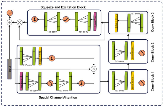 where represents the sigmoid activation function, on the other hand, the spatial attention block is comprised of 5 layers. First, an adaptive average pooling layer is used, which provides global feature understanding. Then, a 1 × 1 convolutional layer is used to reduce the number of channels by a factor of 16, thereby balancing the computational cost. A ReLU activation function then follows it to introduce non-linearity. Following that, another 1 × 1 convolutional layer is applied to restore the original number of channels. And finally, a sigmoid activation function is employed for feature scaling to highlight the most critical features and suppress the less important ones. It can be represented as: