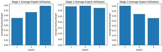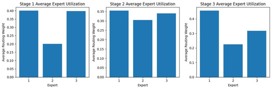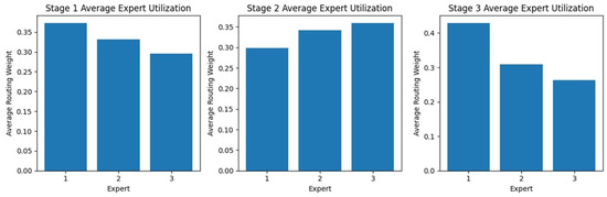 Figure 9 shows the expert usage across the three stages, showing different patterns indicating a varying dependence on different experts through the process. In the first stage, Experts 1 and 3 have the most significant usage; Expert 2, on the other hand, falls below the norm, receiving a much lower routing weight. Stage 2 is more evenly utilized, with nearly equal use of Experts 1 and 3 and a slight improvement from Stage 1 for Expert 2. In Stage 3, Expert 1’s usage is at a maximum, while Expert 2 again has the lowest routing weight, and Expert 3 has moderate usage. These findings suggest possible preferences or specializations among experts, as some experts receive higher reliance at different stages.