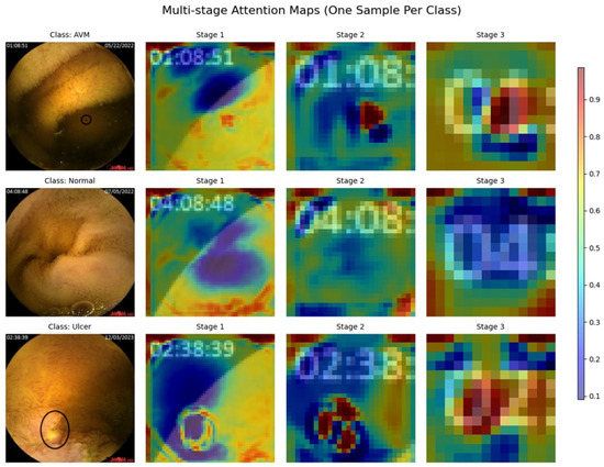 The multi-stage attention maps represent the sequence of feature focus across three stages for AVM, Normal, and Ulcer, as shown in Figure 11. Attention begins widely dispersed and less intense in Stage 1, considering broader areas on the map. As the stages progress, the attention map focuses on increasingly precise and smaller regions of interest. For both AVM and Ulcer, Stage 3 points almost precisely at the localized abnormality, showcasing the model’s pertinent feature focus for clear pathologies. Attention for the Normal class remains relatively dispersed, hence consistent with no evident distinguishing pathological features. Gradual progress shows that the model could filter out unimportant details and instead highlight important diagnostic clues, which justifies its good performance in classification.