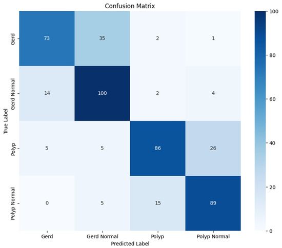 The classifying model achieves a global accuracy of 75.32%, indicating strong performance. In the context of F1-scores of classes, the range varies from 72–78%, with Polyp Normal getting the highest of 78% and Polyp getting very close to that with 76%. In terms of recall, the model performs better in identifying Gerd Normal and Polyp Normal cases, which have recall values of 83% and 82%, respectively. Gerd has the lowest recall, at 66%, thus making it a class for which there are more false negatives. For precision, the Polyp and Gerd Class is showing a precision score of 82% and 79% respectively, while the other two classes, i.e., show slightly lower values. The macro and weighted averages for precision, recall, and F1-score, however, remain stable at around 75% and reflect balanced performance across the dataset. The detailed classification report is shown in the Table 2. These results can be validated through the confusion matrix given in the Figure 12.