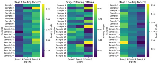 Figure 10 illustrates the routing patterns across the three stages for 20 samples, which exhibit dynamic changes in how samples are assigned to experts based on the routing weights. Stage 1 has an uneven distribution, with some samples receiving a significantly higher weight for sure experts, most notably Experts 1 and 3. At the same time, Expert 2 is clearly underutilized due to the much lower intensities of its assigned routing weights. In Stage 2, routing weights have become more evenly distributed among the three experts, although some variation remains. By Stage 3, the routing weights for specific samples have evolved towards not only Expert 1 but also some other expert, with Expert 2 continually having lower assignments for so many. The color variations suggest that certain samples may preferentially select specific experts, potentially indicating underlying decision-making dynamics. These results suggest significant differences in how various experts are used.