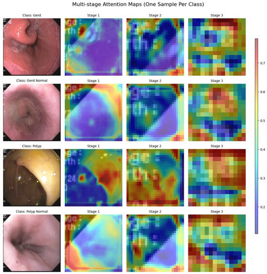 The attention maps of the three stages, as shown in Figure 15, display a progressive enhancement in how features are extracted for different gastrointestinal conditions. In Stage 1, attention is widely distributed, concentrating on broader areas with less specificity. When going to Stage 2, attention narrows in on critical areas, with some noise remaining. Stage 3 focused its attention firmly and carefully on abnormal cases, such as GERD and Polyps. In contrast, the attention is dampened for typical cases (GERD Normal and Polyp Normal), which is in line with the absence of distinctly identifiable lesions. Such refinements in stages imply a learned ability by the model to highlight the most important diagnostic features, ultimately aiding in better classification efficiency.