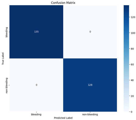 Table 3 demonstrates that the classification model is able to reach perfect accuracy: 100%, which attests to its highly qualitative performance between bleeding and non-bleeding cases. Both classes achieved a precision, recall, and F1-score of 100%, which means that none of the samples are misclassified, and each one is identified correctly. The macro and weighted averages indicate balanced performance across the dataset. These results indicate that the model has learned the distinguishing features of each class with high confidence, making it a reliable classifier for the task at hand. These results can be validated through the confusion matrix shown in the Figure 16.