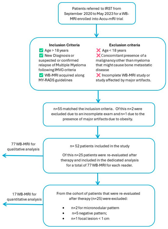 All patients who have been referred to IRST from September 2020 to May 2023 for a WB-MRI and enrolled into the Accu-mRI trial (L1P788_IRST) have been retrieved. Only those who met the following inclusion criteria were enrolled: (1) Age > 18 years, (2) new diagnosis or suspected or confirmed relapse of multiple myeloma following IMVG criteria; and (3) complete WB-MRI acquired along MY-RADS guidelines.