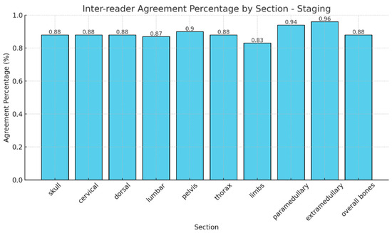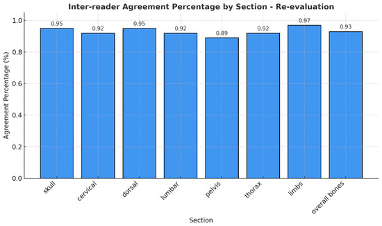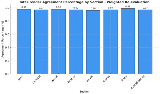 Notably, no mixed responses were observed by any of the readers across all regions, so we considered only one RAC for each anatomic segment. The observed agreement of different RAC across the evaluated anatomical regions was consistently high, with percentages ranging from 89% (pelvis) to 97% (arms) (Figure 3). Cohen’s Kappa values indicated substantial to excellent agreement, ranging from 0.83 in the pelvis to 0.95 in the arms. Similarly, Brennan and Prediger’s agreement coefficients supported these findings, with values ranging from 0.87 (pelvis) to 0.97 (arms) (Table 2). The confidence intervals for both Kappa and Brennan and Prediger’s coefficients were narrow, reflecting high precision and further supporting the reliability of the assessments, particularly in the cranium, dorsal, and overall bone evaluations.