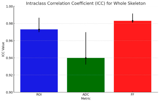 Considering the whole skeleton, the ICC values for whole-skeleton measurements indicate excellent inter-observer reliability across all metrics. The highest agreement was observed for rFF% with an ICC of 0.98 (95% CI: 0.98–0.99), and the ADC showed slightly lower but still strong agreement, with an ICC of 0.94 (95% CI: 0.93–0.97).