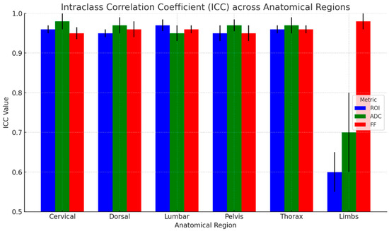 The results of ICC analysis on ADC and rFF% values and ROI area are graphically shown in Figure 5 for all the anatomical regions taken into consideration, and the detailed regions are shown in Figure 6. We report excellent agreement among the three radiologists in both ROI area, ADC, and rFF% values, except for the limbs, where we obtained a moderate agreement of 0.63 for ROI area, a good agreement for ADC values, and an excellent agreement for rFF% values.