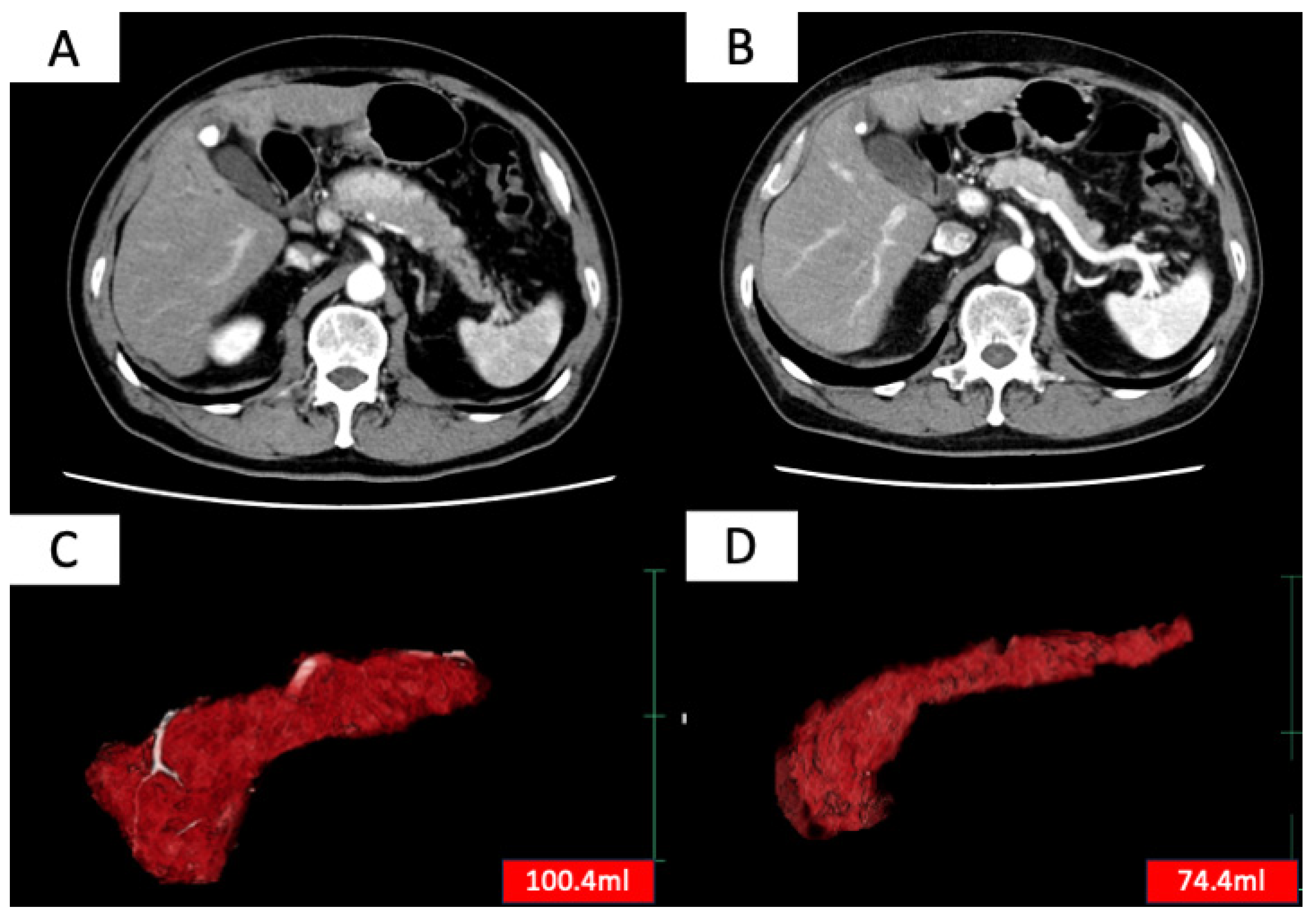 | Reduction rate of pancreas volume, % (range) | 60.2 (24.5–86.9) | 48.4 (0.4–80.5) | 0.04 |