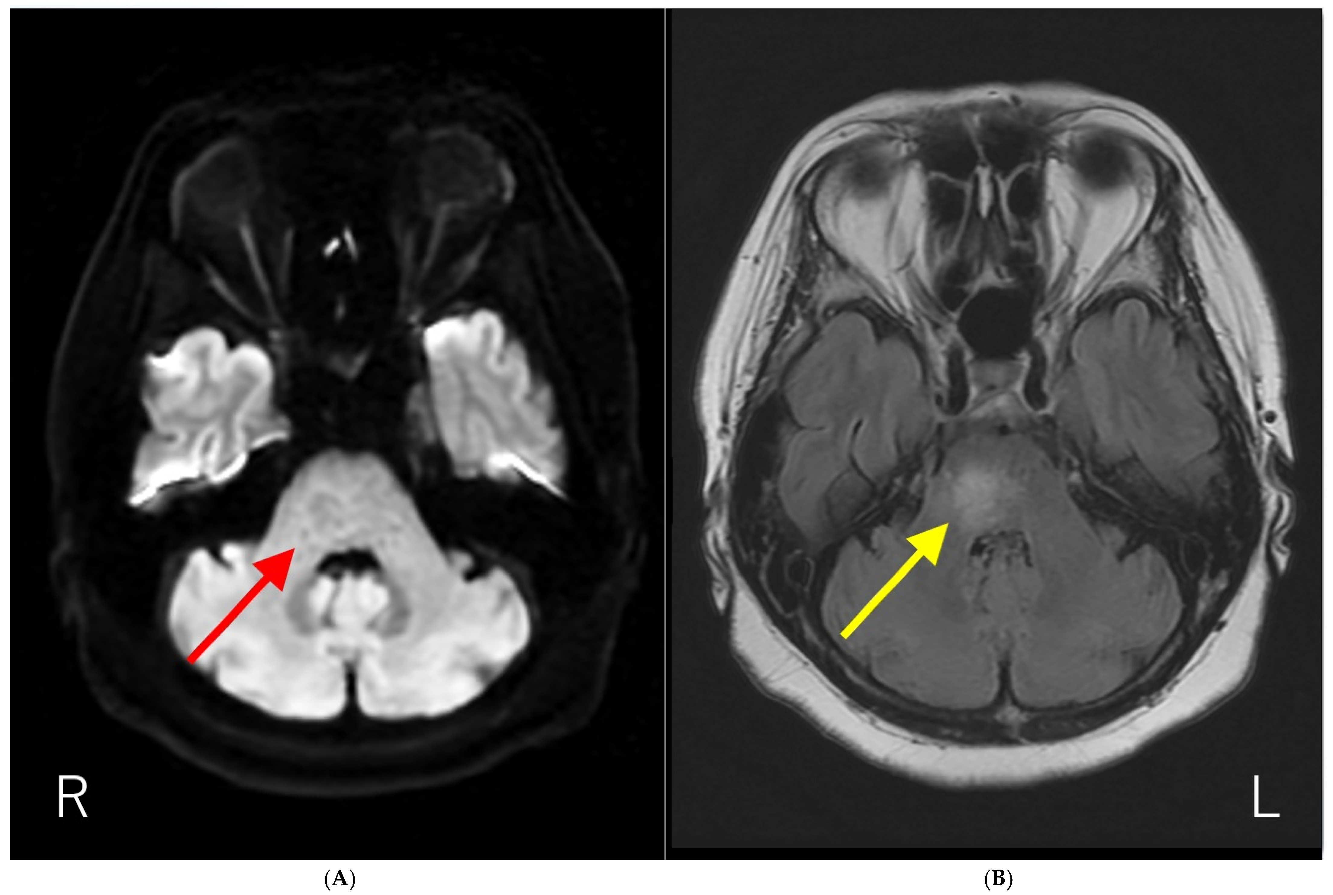 Figure 1. Brain magnetic resonance imaging (MRI) results. (A) Diffusion-weighted brain MRI showing ring-like hyperintensity in the pons (red arrow). (B) T2-fluid attenuated inversion recovery imaging (T2-FLAIR) showing hyperintensity with fuzzy borders in the pons (yellow arrow). The patient had a history of influenza vaccination immediately before the development of neurological symptoms. In addition, the anti-AQP4-Ab test by ELISA methods was negative. Initially, we suspected acute disseminated encephalomyelitis (ADEM) based on the temporal proximity of vaccination and neurological symptoms. Subsequently, anti-AQP4-Ab were detected using a cell-based assay, and the patient was diagnosed with neuromyelitis optica spectrum disorder (NMOSD). NMOSD is a group of autoantibody-mediated chronic inflammatory central nervous system (CNS) diseases that are distinct from multiple sclerosis (MS) [1,2]. Historically, it was initially described by Devic in 1894 as “neuro-myélite optique aiguë,” which translates to “neuromyelitis optica acuta,” after he described a case of bilateral blindness and paraplegia [1,2]. For much of the 20th century, the diagnosis was typically made in patients with a monophasic syndrome of severe, nearly simultaneous optic neuritis and myelitis [3]. A major breakthrough occurred in 2004 with the discovery of serum autoantibodies (initially called NMO-IgGs) specific for NMO, which were subsequently shown to target the astrocytic water channel aquaporin-4 (AQP4) in 2005 [2,3]. The detection of these anti-AQP4-Ab is now a central component of diagnostics in NMOSD [1]. This discovery expanded the understanding of the disease, leading to the broader term “NMOSD” to encompass a spectrum of clinical symptoms and MRI findings associated with anti-AQP4-Ab seropositivity [4,5]. Brain lesions are common but often asymptomatic, with typical locations including periependymal surfaces of the third and fourth ventricles, area postrema, corpus callosum, hypothalamus, and thalamus [1,2,3]. As far as we know, the report of the solitary pons lesion in NMOSD is limited [6].