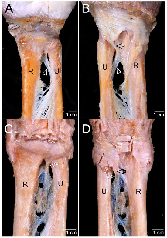 - Hohenberger, G.M.; Schwarz, A.M.; Weiglein, A.H.; Krassnig, R.; Kuchling, S.; Plecko, M. Prevalence of the distal oblique bundle of the interosseous membrane of the forearm: An anatomical study. J. Hand Surg. Eur. Vol. 2018, 43, 426–430. [Google Scholar] [CrossRef] [PubMed]