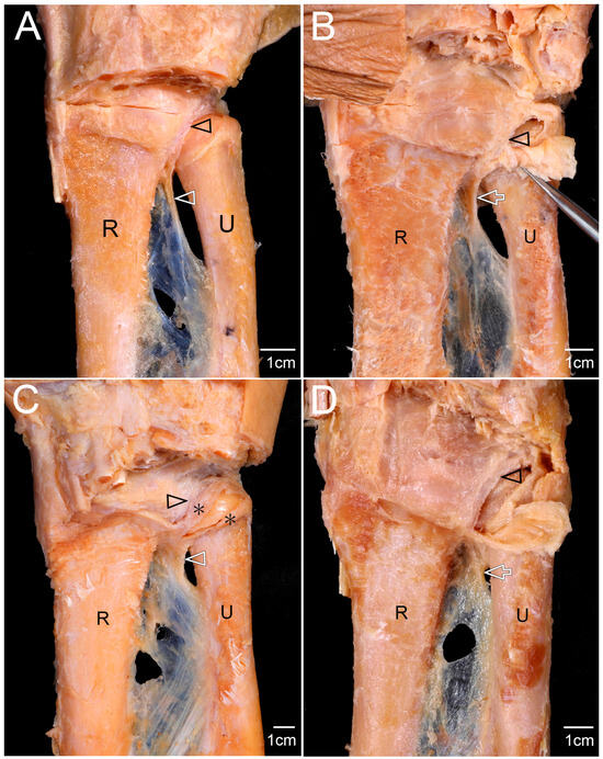 Attachment of distal interosseous structures to the articular disc of the distal radioulnar joint (DRUJ). (A) The DOB (white arrowhead) was attached to the proximal anterior margin of the articular disc (black arrowhead). The palmar radioulnar capsule was removed. (B) In specimens lacking a DOB, a membranous thickening (white arrow) of the distal interosseous membrane was attached to the proximal anterior portion of the articular disc (black arrowhead). The palmar radioulnar capsule was partially incised and reflected to expose the disc. (C) The DOB (white arrowhead) was not attached to the disc (black arrowhead), but extended toward the periphery of the articular cartilage of the ulnar head (asterisks). The palmar radioulnar capsule was partially removed to expose the cartilage. (D) The membranous thickening (white arrow) of the distal interosseous membrane was attached to the palmar radioulnar joint capsule, without connection to the articular disc (black arrowhead). The capsule was partially incised and reflected. R, radius; U, ulna.