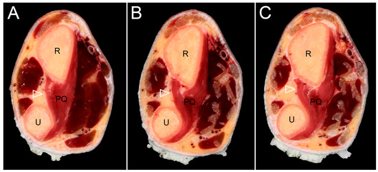 Serial transverse sections of the distal forearm. From proximal to distal (A–C), the distal interosseous membrane (arrowheads) gradually assumed an oblique orientation as it approached the distal radioulnar joint (DRUJ). This slanting plane corresponded to the distal structural change in the membrane, which formed either the DOB or a membranous thickening. PQ, pronator quadratus; R, radius; U, ulna.