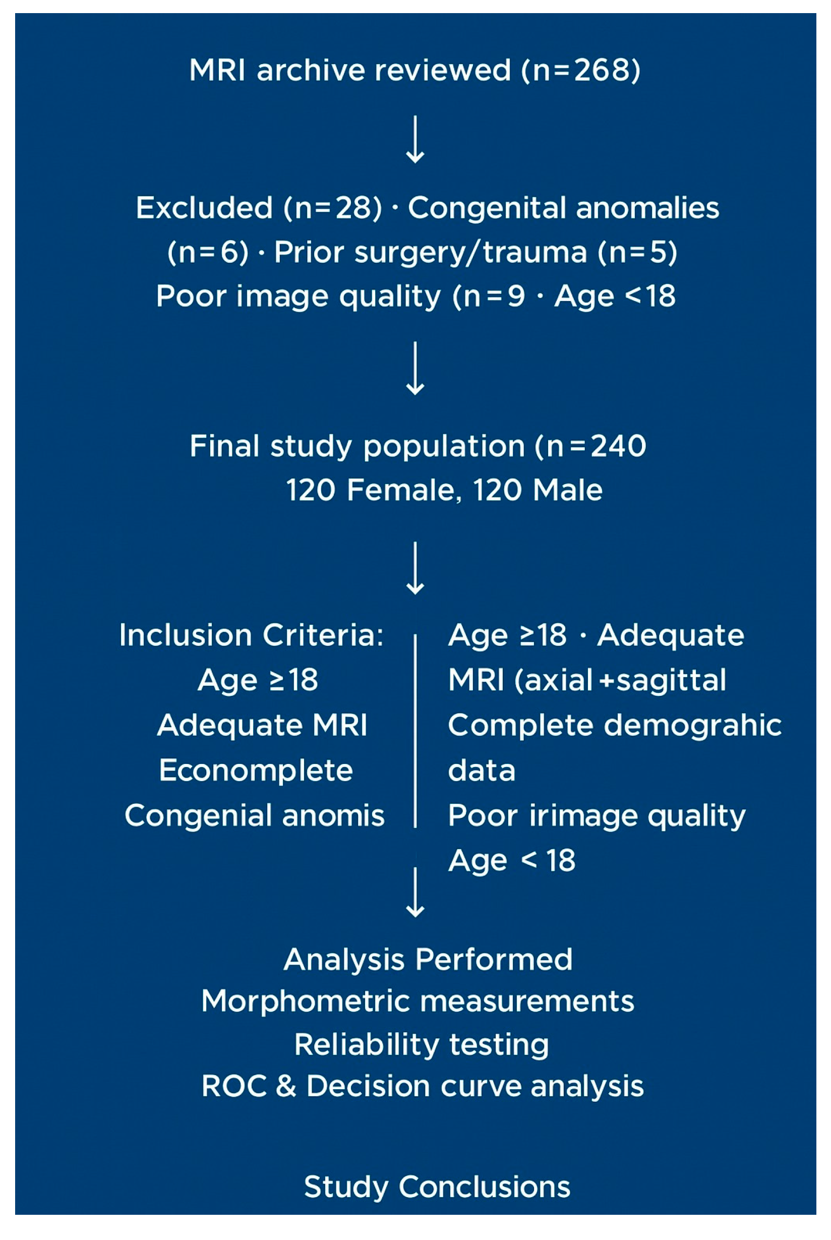 The lumbosacral MRI archive of a tertiary university hospital was reviewed between 1 January 2024, and 1 January 2025. Initially, 268 cases were evaluated, 28 of which were excluded according to the exclusion criteria. The final analysis included 240 patients (120 women and 120 men; mean age: 51.2 ± 21.2 years). The criteria for patient selection and exclusion are presented in the flowchart (