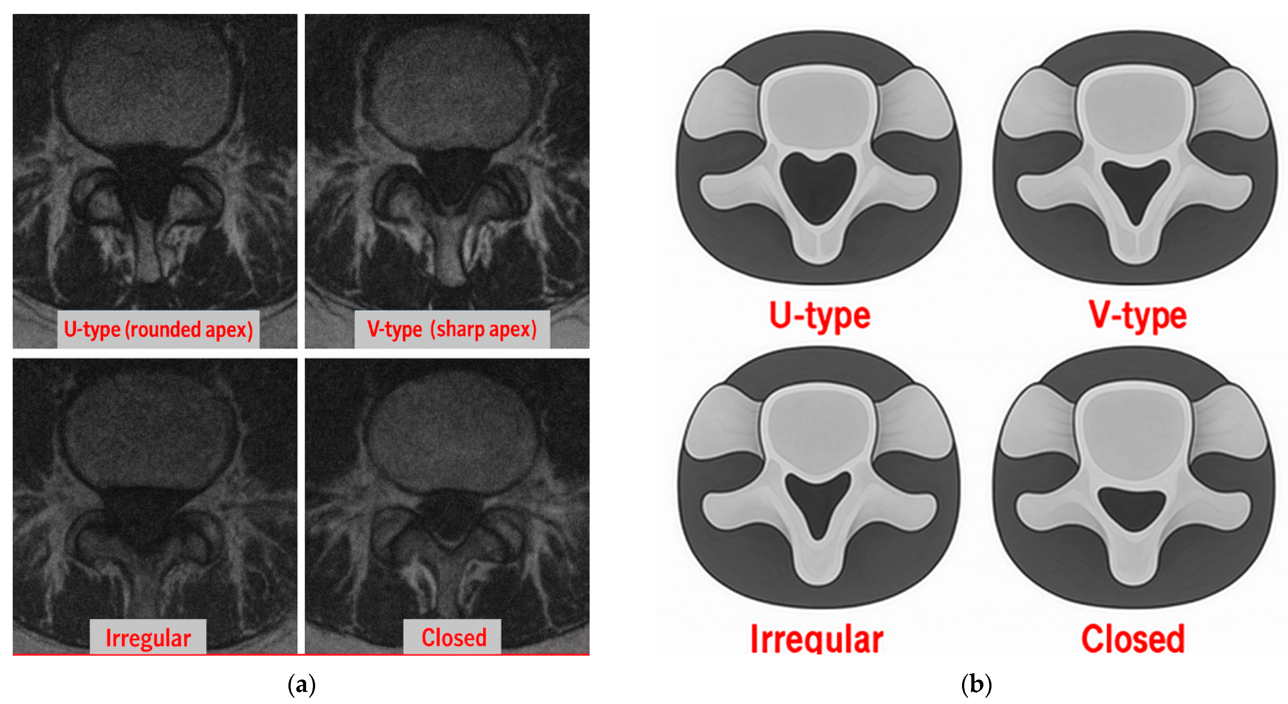 Morphological types pertaining to the sacral hiatus (Axial MRI Images). (a) Four morphological types of sacral hiatus identified via axial T2-weighted MRI: one U-type (rounded apex), one irregular, and two closed variations. (b) Four morphological variations are illustrated: U-type, V-type, irregular, and closed. Abbreviations: MRI, Magnetic Resonance Imaging.