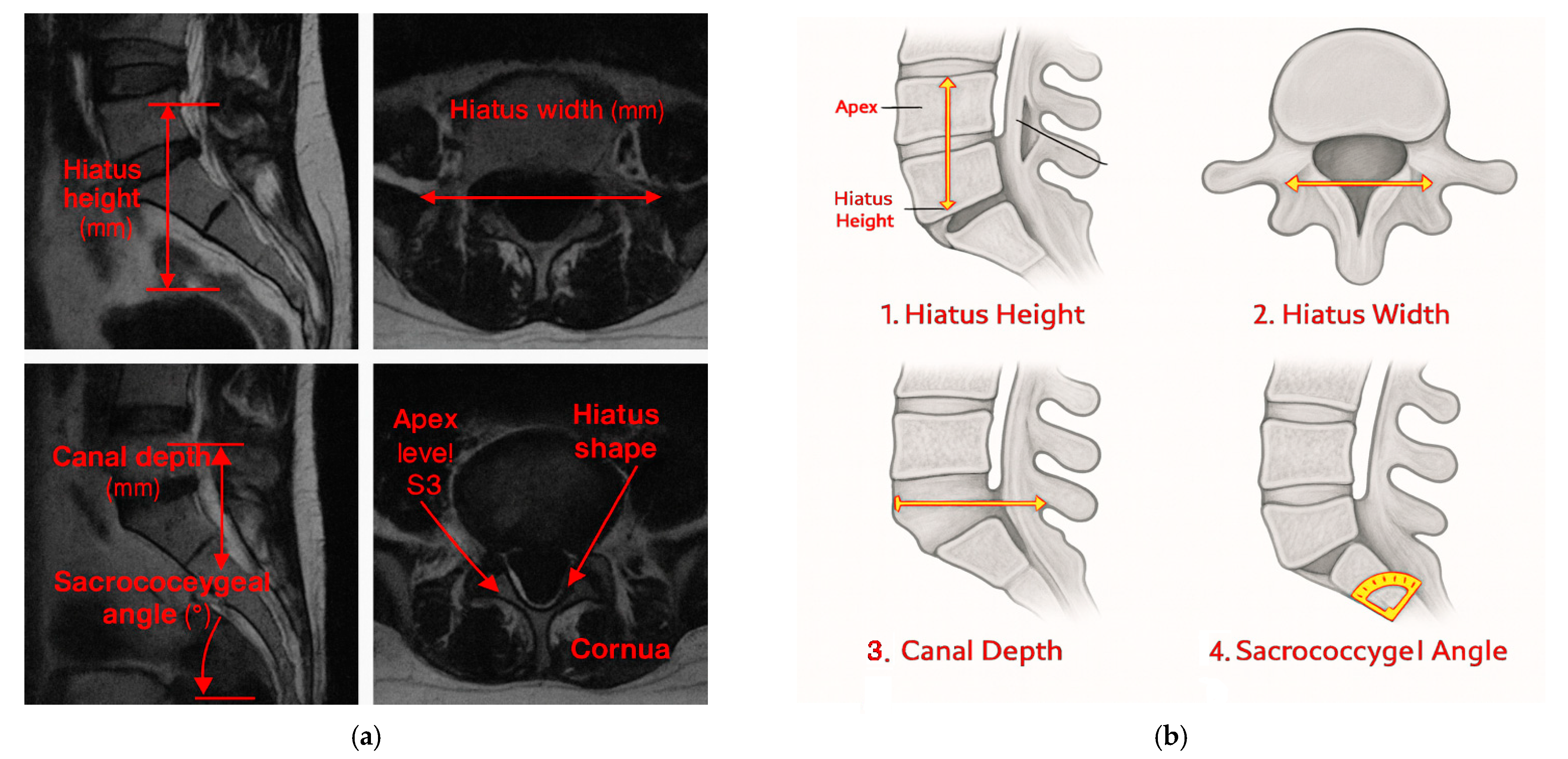 - Bagoji, I.B.; Durgawale, S.S.; Patil, S.; Barham, C.R. A morphometric and radiological study of sacral hiatus with its clinical relevance in caudal epidural block. Maedica 2020, 15, 468–476. [Google Scholar] [CrossRef]