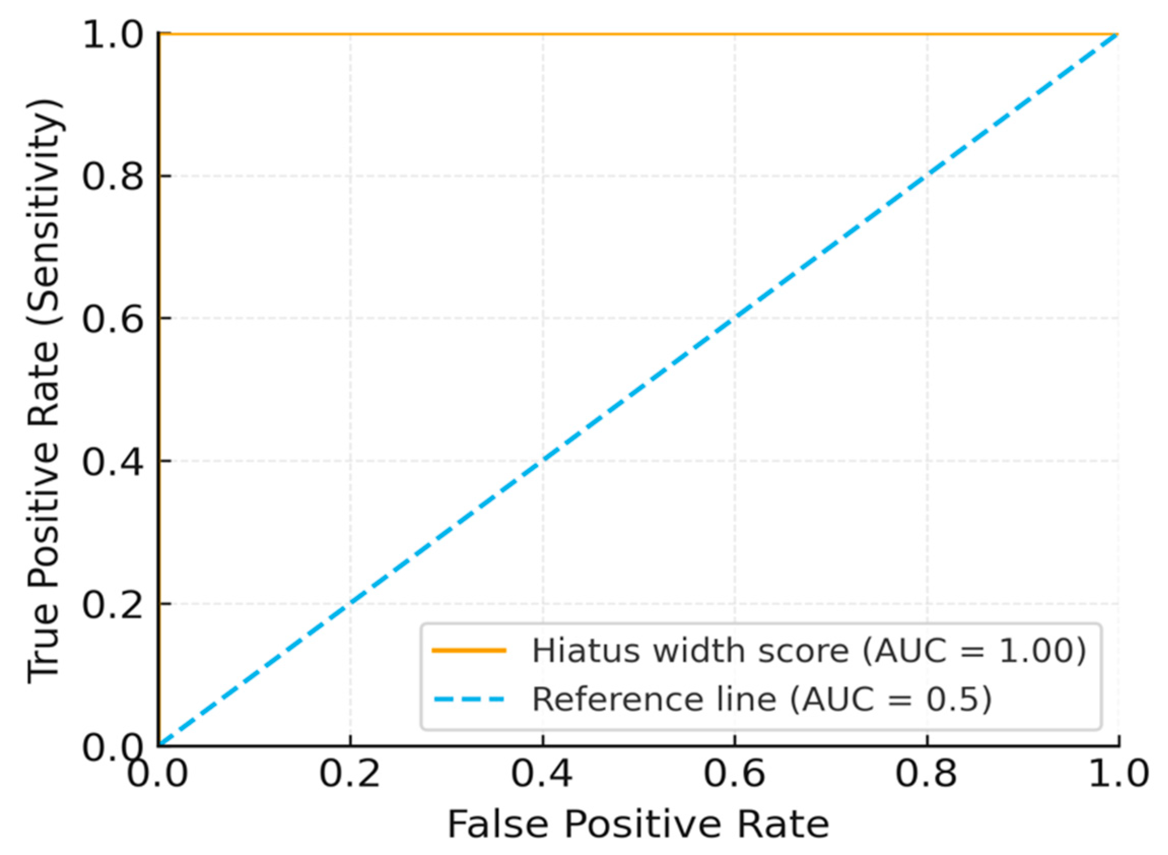 ROC curve regarding hiatus width’s ability to predict block failure. Scores were defined as −(hiatus width) so that higher scores indicate higher failure risk. The AUC was computed with DeLong 95% CI.