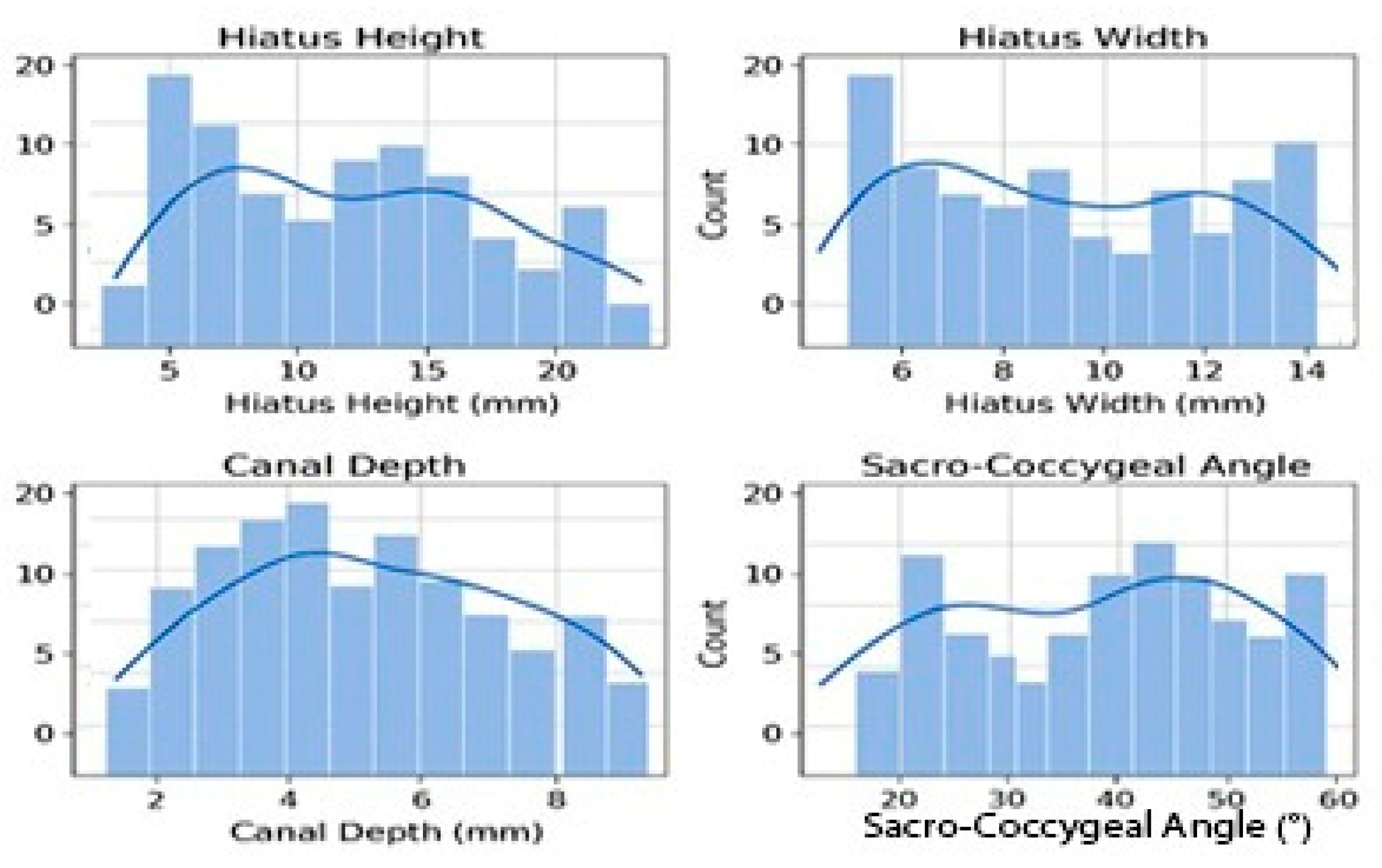 The mean hiatus height, hiatus width, canal depth, and sacrococcygeal angle were 16.5 ± 7.4 mm (median: 15.9; IQR: 11.3–21.4), 9.9 ± 3.0 mm (median: 9.5; IQR: 7.6–12.0), 5.9 ± 2.2 mm (median: 5.7; IQR: 4.2–7.3), and 40.8 ± 11.1° (median: 40.2; IQR: 33.1–48.9), respectively. Shapiro–Wilk testing showed a normal distribution for hiatus height and width, whereas canal depth and sacrococcygeal angle showed mild deviation. The results are detailed in