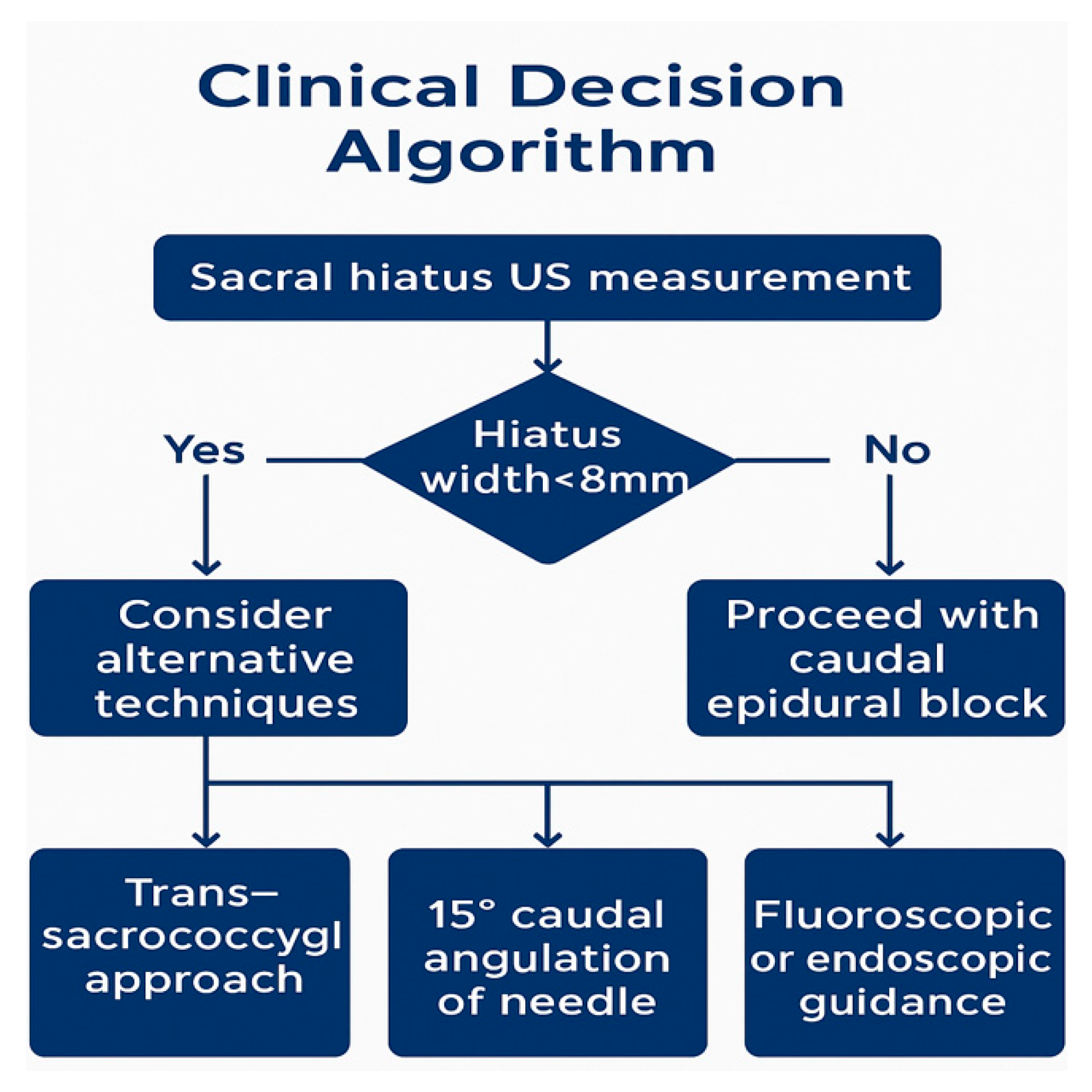 Clinical decision algorithm for caudal epidural blocks. Proposed decision algorithm based on ultrasound (US) hiatus measurement. Alternative approaches (trans-sacrococcygeal, angled needle, and fluoroscopy/endoscopy) should be considered when width <8 mm. Abbreviations: US, Ultrasound.