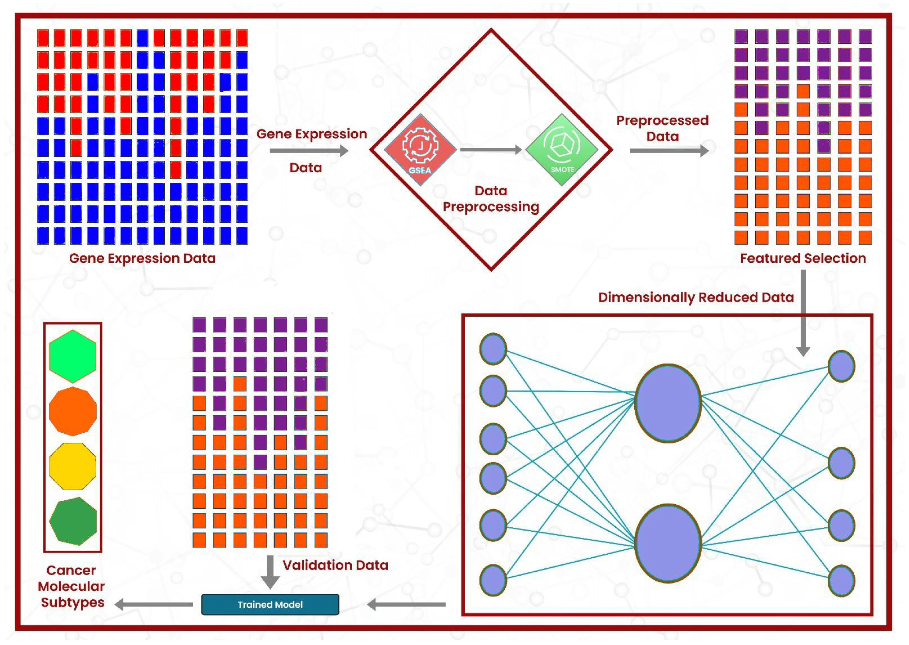 | [26] | Gene expression data | Subtype-specific genes are extracted and then entered into the feedforward NN. L1 and L2 regularization and dropout are used to avoid overfitting | The effectiveness of the proposed framework is highly dependent on the training dataset, limiting its generalisability to unseen data. |