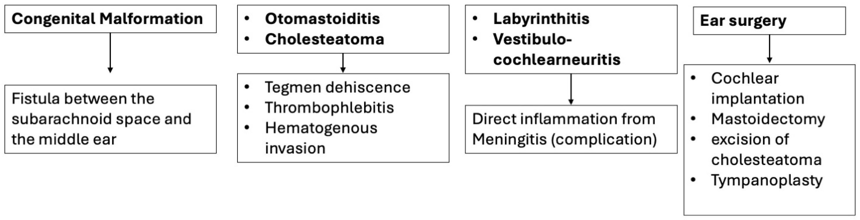 Iatrogenic Causes (Ear Surgery, Cochlear Implants)Gowrishankar et al., 2023 [38]; Reefhuis et al., 2003 [39]; Howitz & Homøe 2014 [40]; Nielsen & Thomsen 2000 [41]Systematic review, retrospective cohort, case reportsPost-cochlear-implant meningitis risk = 0.07%; increased in children and malformations; mastoidectomy and stapedotomy occasionally associated.