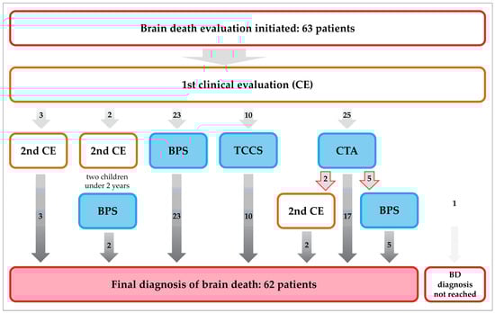 Of the 63 patients evaluated for BD in the study period, only 10 patients underwent TCCS as the ancillary perfusion test. This low number can be attributed to the fact that TCCS is also performed in many patients prior to the formal BD determination procedure, thereby allowing for the determination of ultrasound feasibility, i.e., the presence of a transcranial bone window. Furthermore, non-operator-dependent methods, such as CTA and BPS, are preferred.