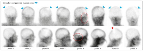 Planar scintigraphic images of all patients who underwent DC, posterior (upper row) and right lateral (lower row) views. The craniectomy defects (blue arrowheads) were best visualized from the posterior view. In patient no. 18, activity was seen projecting onto the cerebellum (red circle), which was further evaluated by SPECT/CT (see also Figure 4). In patient no. 25, the stripe of low uptake on the lateral view (red arrowhead) correlated with the long postoperative scalp suture following bilateral DC.