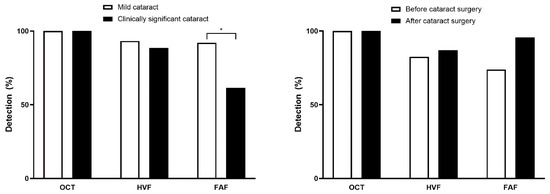 Detection rates of hydroxychloroquine retinopathy by optical coherence tomography (OCT), Humphrey visual field (HVF), and fundus autofluorescence (FAF) in eyes with mild versus clinically significant cataract (left) and pre- versus post-cataract surgery (right). Asterisk indicates statistical significance (p < 0.05).