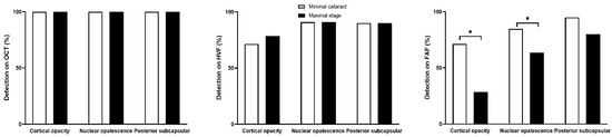 Supplemental Figure S4 presents the prevalence of clinically significant cataracts by type and stratified by age. There were no significant differences between patients under 65 and those 65 or older in the prevalence of posterior subcapsular cataract (p = 0.757) or cortical opacities (p = 0.221), whereas nuclear opalescence was significantly more common in the older patients (p = 0.001). Figure 3 illustrates the effects of each type of clinically significant cataract on FAF sensitivity, revealing a more marked decrease at the maximum stage (28.6%) as compared to the minimum stage (71.4%) in eyes with clinically significant cortical opacities (p = 0.041). Eyes with clinically significant nuclear opalescence showed a moderate reduction in FAF detection at the maximum stage of cataracts (84.8% to 63.6%; p = 0.023), whereas clinically significant posterior subcapsular cataract did not impact detection (95% vs. 80%; p = 0.248). OCT and HVF detection rates were unaffected by cataract severity (all p > 0.05).
