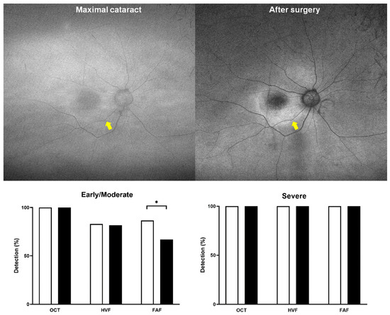 Photographic examples showing the different effects of cataract for detection of hyper- and hypo-autofluorescence on fundus autofluorescence imaging (top) and bar graphs comparing the sensitivities of OCT, FAF, and HVF in eyes with early/moderate (bottom left) and severe retinopathy (bottom right) between minimal (white bars) and maximal (black bars) cataract severity. Both indicate that severe stage (hypoautofluorescence) is unaffected by cataract or modality but early or moderate stage, as hyper-autofluorescence on FAF (yellow arrows), is significantly affected by maximal cataract severity (p < 0.001). Asterisk indicates statistical significance (p < 0.05).