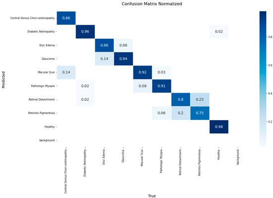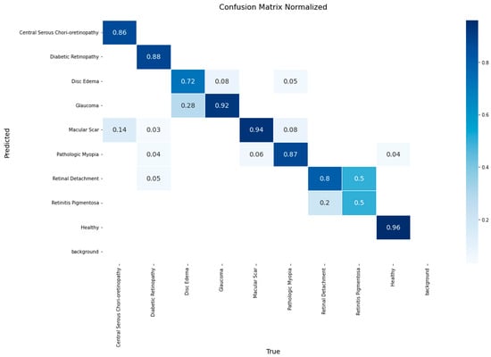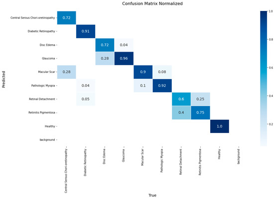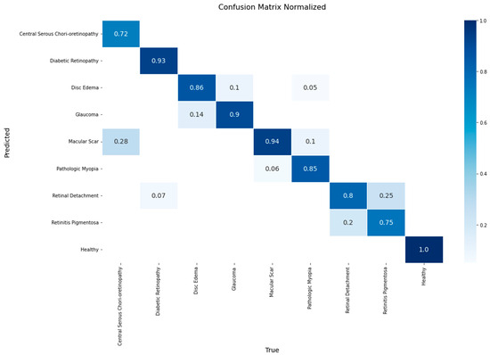 Figure 8. The model demonstrated high efficacy, achieving the highest accuracy rates for the Healthy (1.00), Macular Scar (0.94), and Diabetic Retinopathy (0.93) classes. It also showed robust performance for Glaucoma (0.90) and Disc Edema (0.86). However, the evaluation also highlighted specific diagnostic challenges, particularly in classes with lower recall rates such as Central Serous Chorioretinopathy (0.72) and Retinitis Pigmentosa (0.75). The most significant source of error was the confusion between macular pathologies, where 28% of Central Serous Chorioretinopathy cases were misclassified as Macular Scar. Furthermore, a notable confusion was observed between Retinitis Pigmentosa and Retinal Detachment, with 25% of the former’s cases being misclassified as the latter.