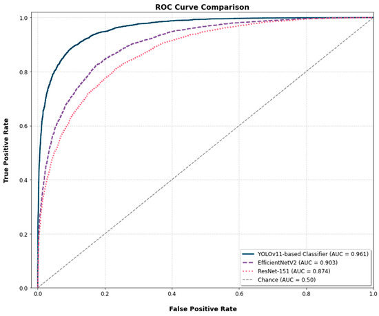 Figure 7). The YOLOv11-based classifier achieved an Area Under the Curve (AUC) of 0.961. The EfficientNetV2 and ResNet-152 models yielded AUC scores of 0.903 and 0.874, respectively. To assess the statistical significance of these differences, the DeLong test was applied. The test confirmed that the AUC of the YOLOv11-based classifier was significantly higher than that of both ResNet-152 (