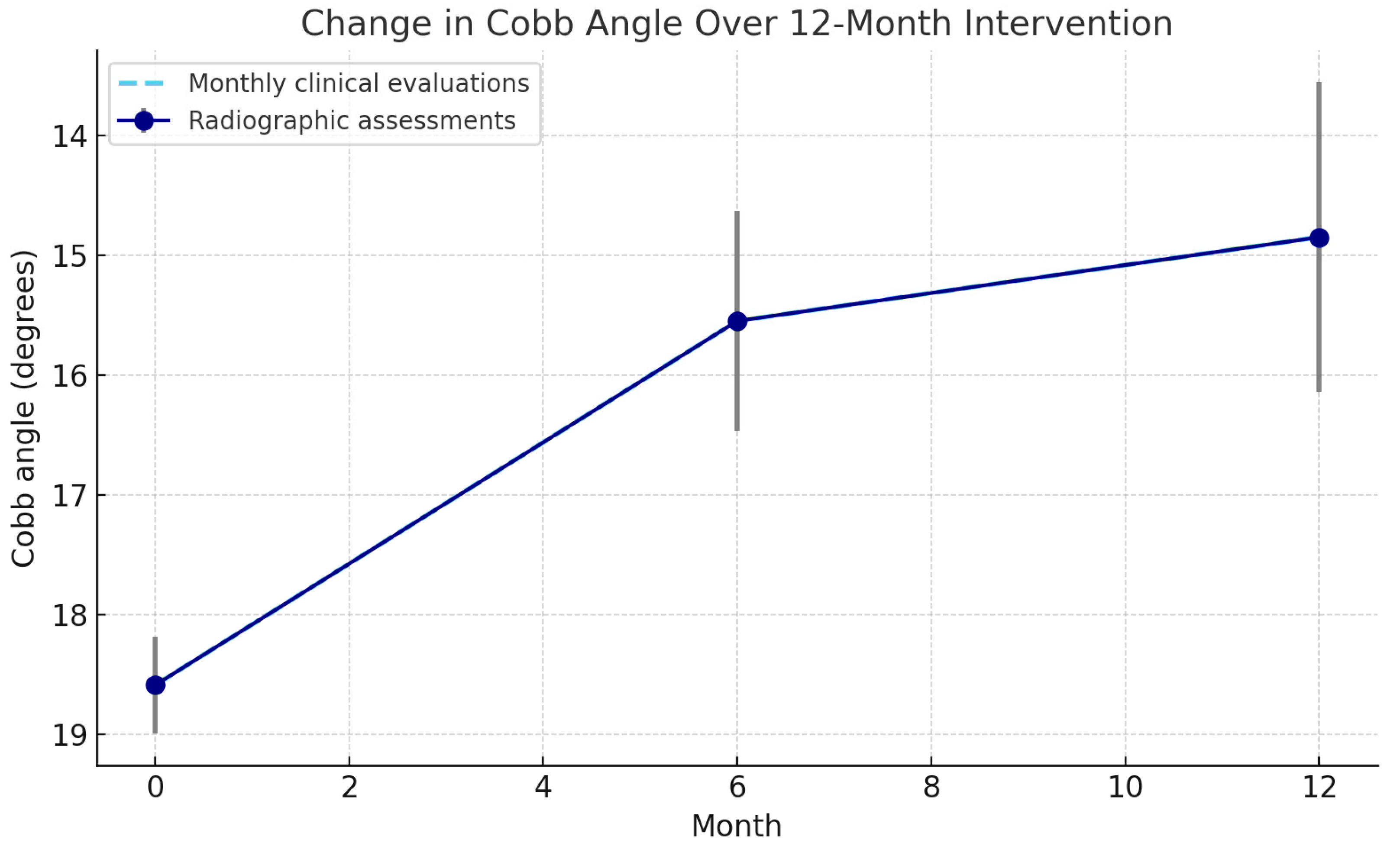 Alignment improvements were maintained consistently across the 12-month program, with no evidence of regression. Radiographic assessments confirmed significant reductions at both 6 and 12 months, and interim clinical evaluations (scoliometer checks, posture grid assessments, and trunk mobility tests) demonstrated steady progress between these time points. These interim assessments served primarily for monitoring, while formal statistical analyses focused on radiographic outcomes.