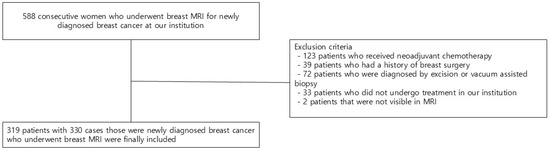 We reviewed the electronic medical records of 588 consecutive patients who underwent breast MRI for newly diagnosed breast cancer. Of the 588 patients, those who initially received neoadjuvant chemotherapy (n = 123), those who had previous breast surgery (n = 39), those who were diagnosed by excision or vacuum-assisted biopsy (n = 72), those who did not undergo treatment in our institution (n = 33), and those with tumors not visible on MRI (n = 2) were excluded. Finally, 319 patients with 330 cases (11 cases of bilateral cancer) were included in the study (Figure 1).
