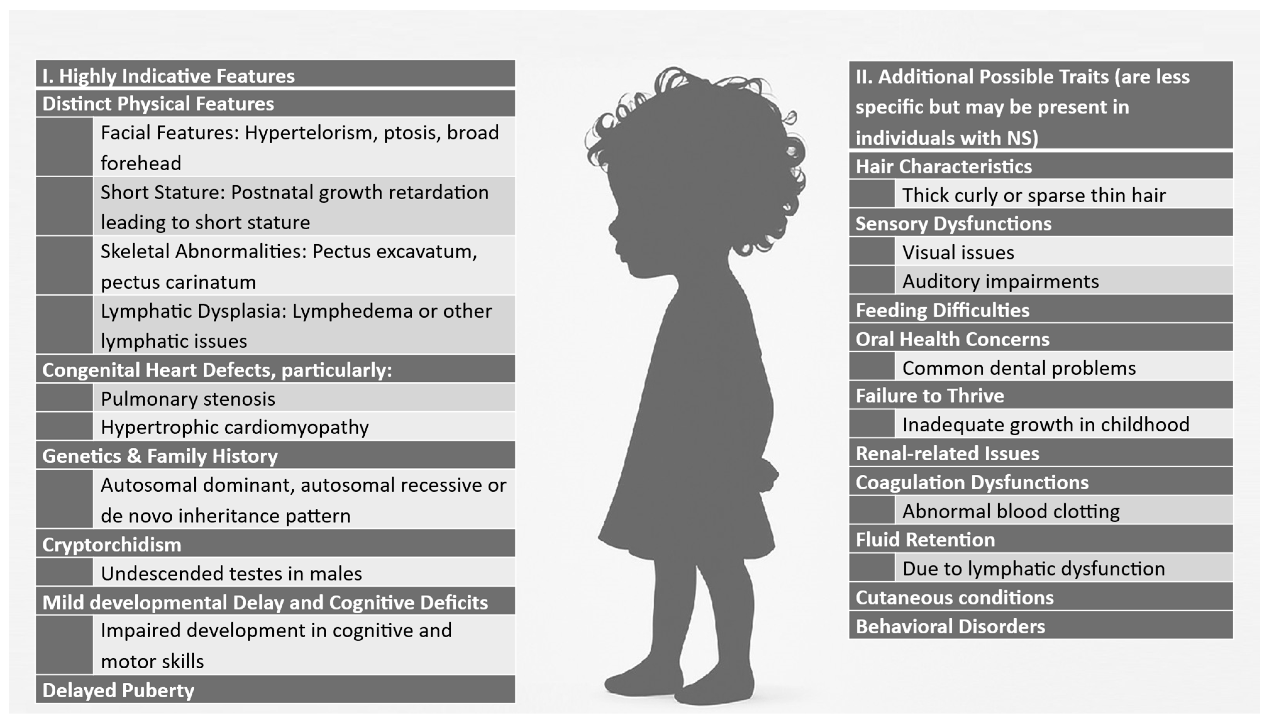 | Genetic Causes | Variants in BRAF, KRAS, MAP2K1, MRAS, NRAS, PTPN11, RAF1, RASA2, RIT1, RRAS2, SOS1, SOS2, LZTR1 (RAS/MAPK pathway); several additional genes, each linked to an NS-like phenotype, were identified in fewer than ten individuals | Hemizygous deletion of 1.5 to 1.8 Mb, approx. 28 genes from 7q11.23; is a contiguous gene deletion syndrome | Deletion of 17q11.2 (including NF1 gene) | [3,17,22,23,24] |