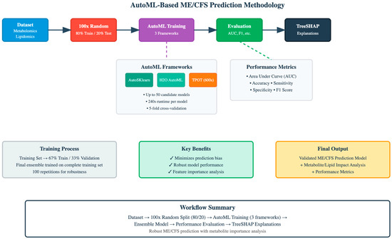 In recent years, high-throughput omics technologies have emerged as powerful tools for uncovering the biological underpinnings of complex diseases [2,3,4]. Metabolomics, the comprehensive study of small-molecule metabolites, provides a direct functional readout of cellular activity and physiological state, offering a unique window into the metabolic disruptions associated with ME/CFS. Several metabolomic studies have suggested perturbations in energy metabolism, including impairments in glycolysis, the tricarboxylic acid (TCA) cycle, and lipid metabolism, pointing towards a state of mitochondrial dysfunction and energetic crisis [5,6,7]. However, analyzing high-dimensional metabolomic and lipidomic data presents significant challenges for traditional statistical methods [8,9]. The sheer number of features, coupled with complex, non-linear interactions, requires sophisticated machine learning (ML) approaches. The process of building an effective ML model—encompassing data preprocessing, algorithm selection, hyperparameter tuning, and validation—is highly specialized and time-consuming. Automated Machine Learning (AutoML) seeks to address this by automating the end-to-end process of applying machine learning, making it accessible to domain experts while often discovering novel and high-performing pipelines that may be overlooked by human experts [10]. While AutoML has shown promise in various biomedical domains, its application to ME/CFS metabolomics and lipidomics remains underexplored. A critical gap exists not only in identifying a high-performance model but also in interpreting its predictions to gain biological insights. Explainable artificial intelligence (XAI) techniques, such as SHAP (SHapley Additive Explanations), combined with comprehensive exploratory data analysis (EDA), are crucial for improving interpretability and transforming a “black box” model into a biologically meaningful analytical framework [11]. These analyses improve interpretability and provide clearer visualization of metabolomic patterns in ME/CFS. Therefore, this study had three primary objectives: (1) To conduct comprehensive EDA, including fold change, correlation heatmap, and Partial Least Squares Discriminant Analysis (PLS-DA) evaluations, to uncover key metabolic variations and enhance the interpretive depth of the dataset; (2) To benchmark the performance of three leading AutoML frameworks—TPOT, Auto-Sklearn, and H2O AutoML—in classifying ME/CFS based on plasma metabolomic and lipidomic data; and (3) To employ SHAP analysis on the optimal model to identify the most impactful metabolites and lipids and elucidate the dysregulated biological pathways they represent, thereby advancing both the diagnostic and pathophysiological understanding of ME/CFS. This integrated approach of competitive AutoML benchmarking coupled with model explainability for pathophysiological discovery in ME/CFS represents a promising contribution to the field.