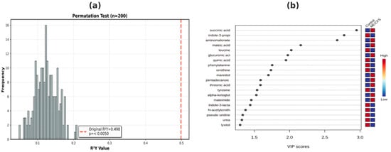 Permutation results and variable importance graph regarding the discrimination power of the PLS-DA model. (a): PLS-DA model permutation test results; (b): PLS-DA model VIP graph.