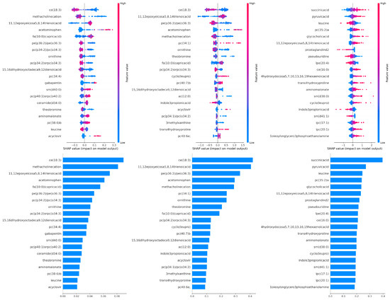 Figure 3 shows the SHAP analysis results for three different models (H2O AutoML, AutoSklearn, and TPOT, respectively). The horizontal scatter plots at the top of each panel visualize the metabolites that are most influential in the model’s prediction and the effect of changes in these metabolite levels on the model output (ME/CFS probability). The SHAP value indicates the direction and magnitude of the metabolite’s contribution to the model prediction; positive SHAP values to the right of zero indicate that an increase in that feature increases the probability of ME/CFS, while negative SHAP values to the left indicate that it decreases the probability. The color of the points represents the relative high (red) or low (blue) level of the metabolite. The concentration of red points in positive SHAP values indicates that an increase in the level of the relevant metabolite increases the probability of ME/CFS, while the presence of blue points on the positive side indicates that low levels increase this probability. The bar graphs at the bottom of each panel rank the average contribution size of metabolites to the model prediction based on mean(|SHAP value|); this allows the importance of metabolites to be compared independently of their contribution.